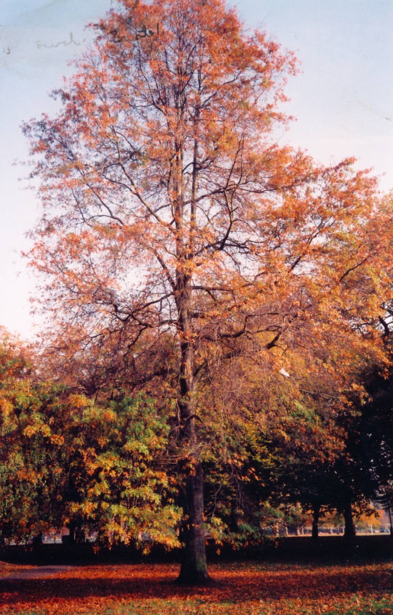 This fine american oak is one of the best trees in the Park for autumn colour. At this time the leaves go yellow, then orange, ending in a brilliant scarlet, with the top of the tree remaining a glossy green. Among american oaks it is recognised as one of the most graceful. It has a tendancy to have a domed top with the lower branches forming what is called a “flaired skirt”. The dome can open with age but ours is still contained. On the downward pointing branches there are thin side shots coming out at right angles. These are the “pins” from which its common name derives.